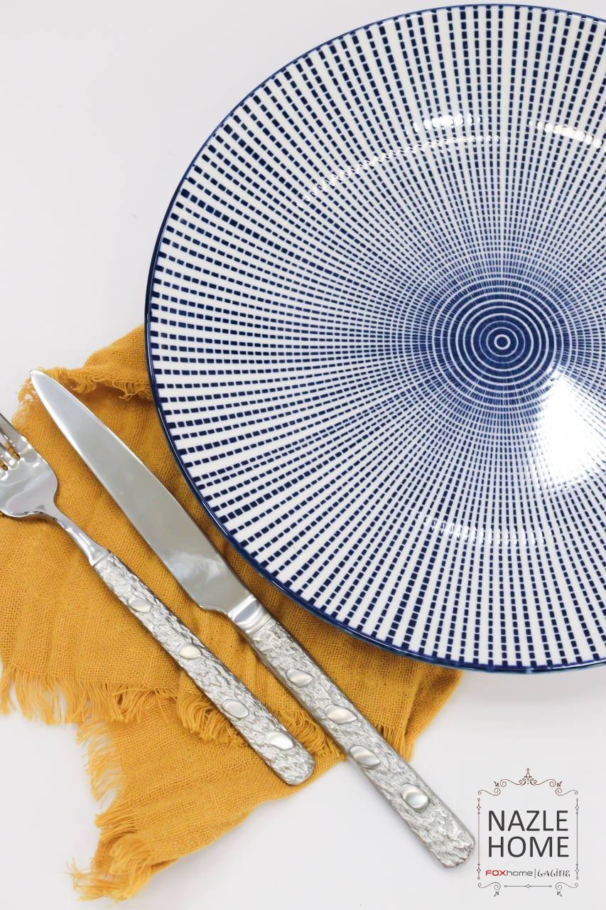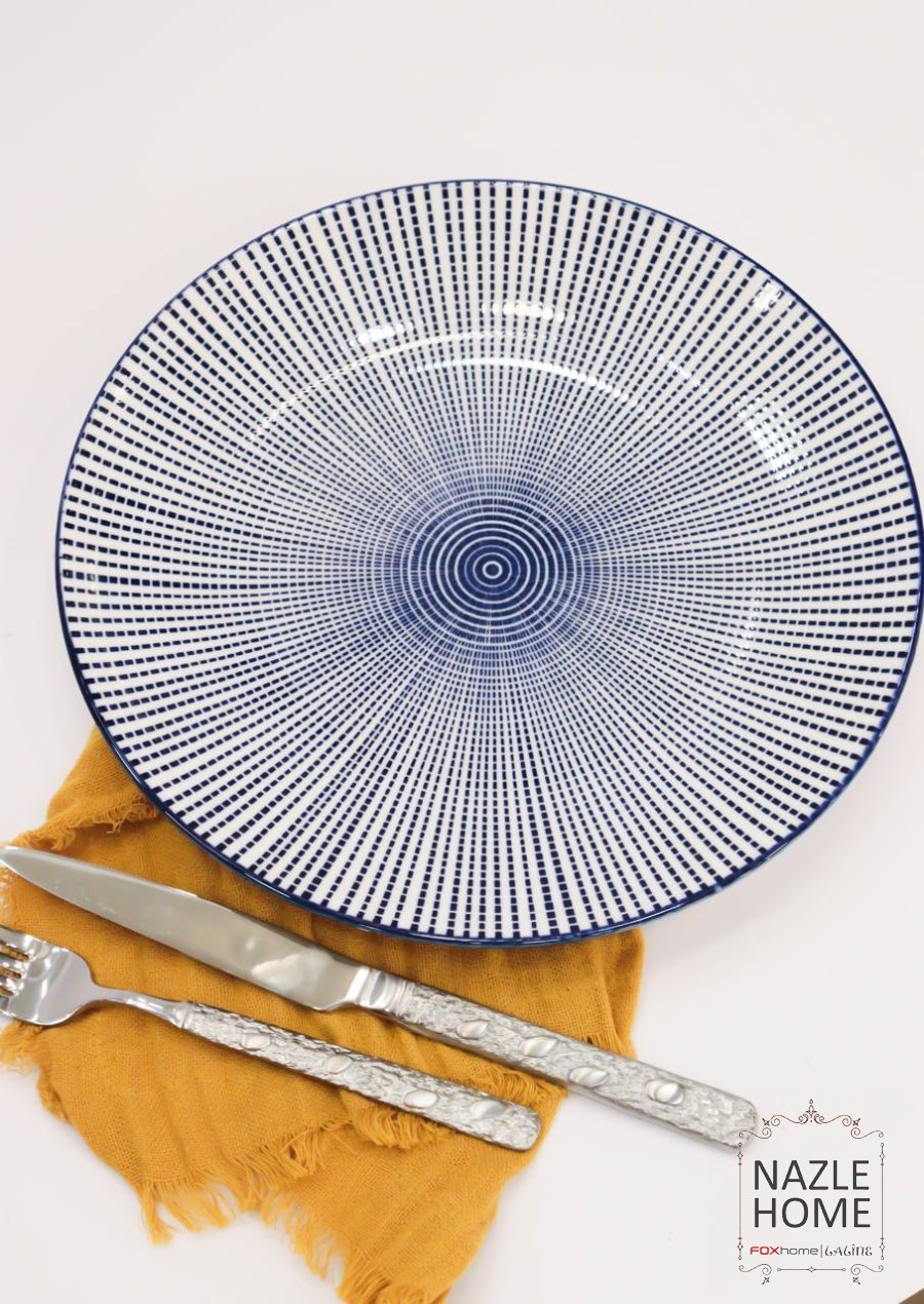 صحن مدور حجم كبير - ازرق وابيض مع نقشة