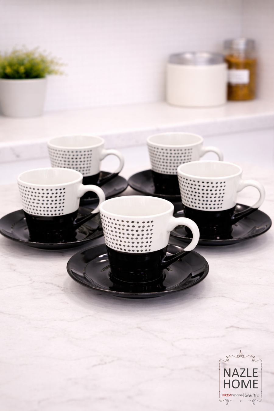 طقم فناجين 6*6 - نقشة نقاط ابيض واسود