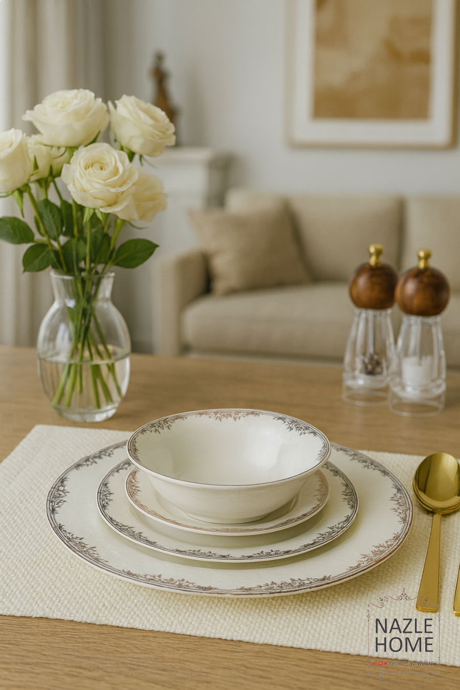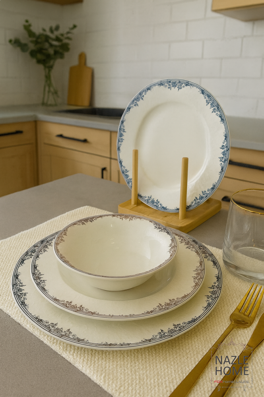 طقم صحون 24 قطعة ابيض منقش كحلي