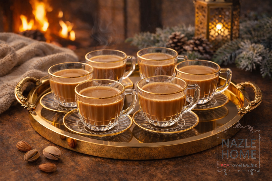 طقم 6 كاسات شاي /نسكافيه مع صحون محزز ذهبي