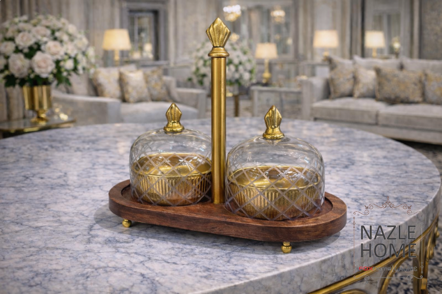 ستاند مضيفة خشب هندي مع ٢ علب نحاس