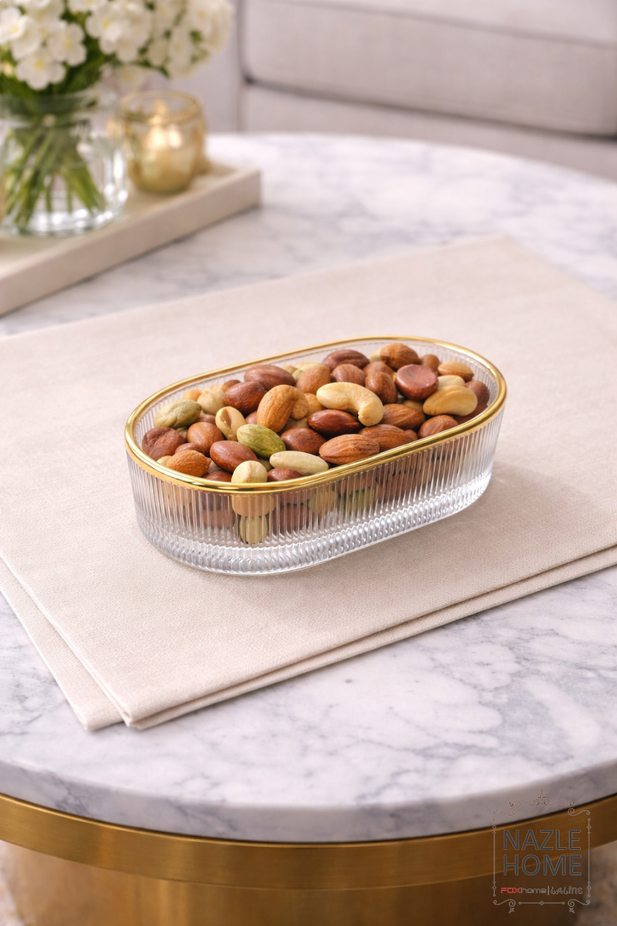 طقم 6 صحون بيضاوي للتقديم شفاف حز ذهبي