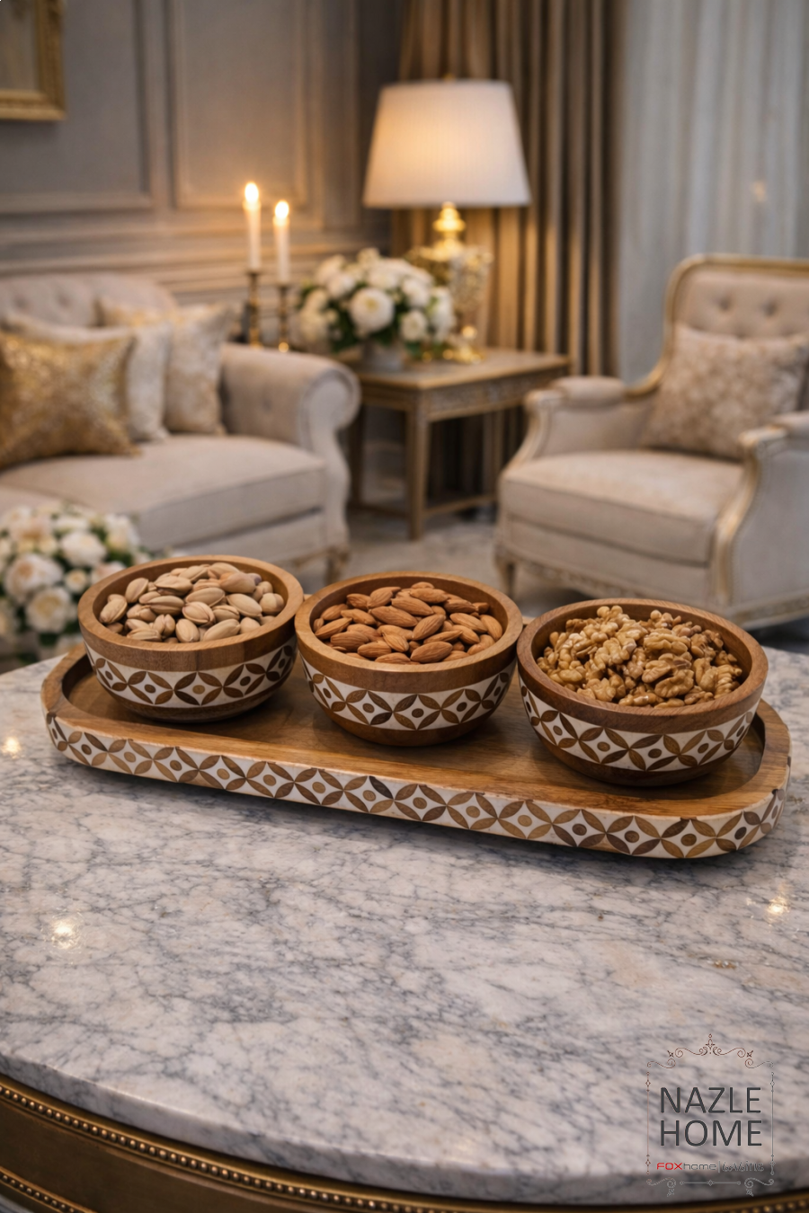 صينيه تقديم مع 3 صحون للمكسرات خشب مع نقشة