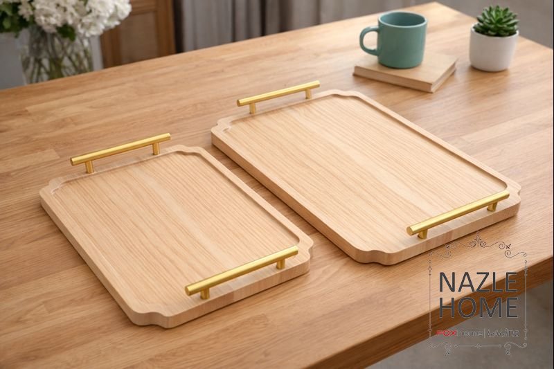 طقم صواني قطعتين خشب فاتح بحفة