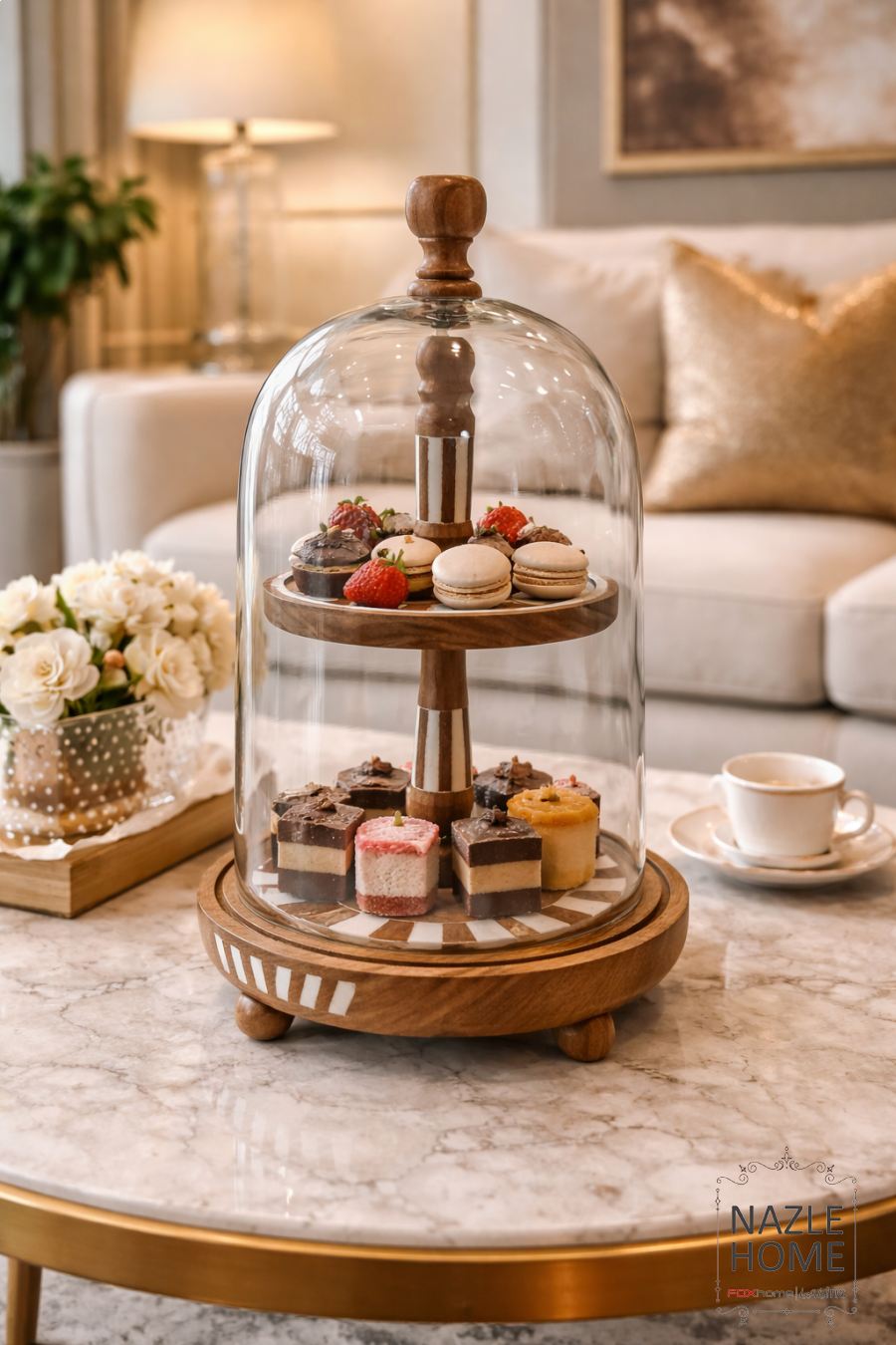 مضيفة تقديم خشب طبقتين مع غطا زجاج
