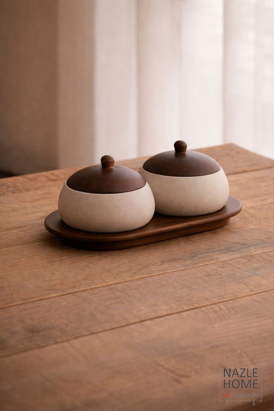 مضيفة تقديم قاعدة خشب مع علبتين فخار