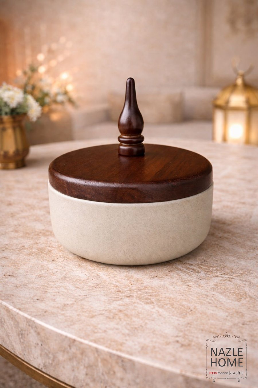 مضيفة تقديم فخار مع غطا خشب