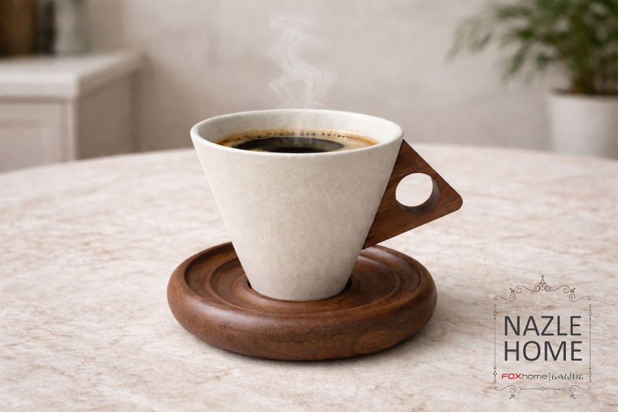 فنجان قهوة مميز مع صحن خشب