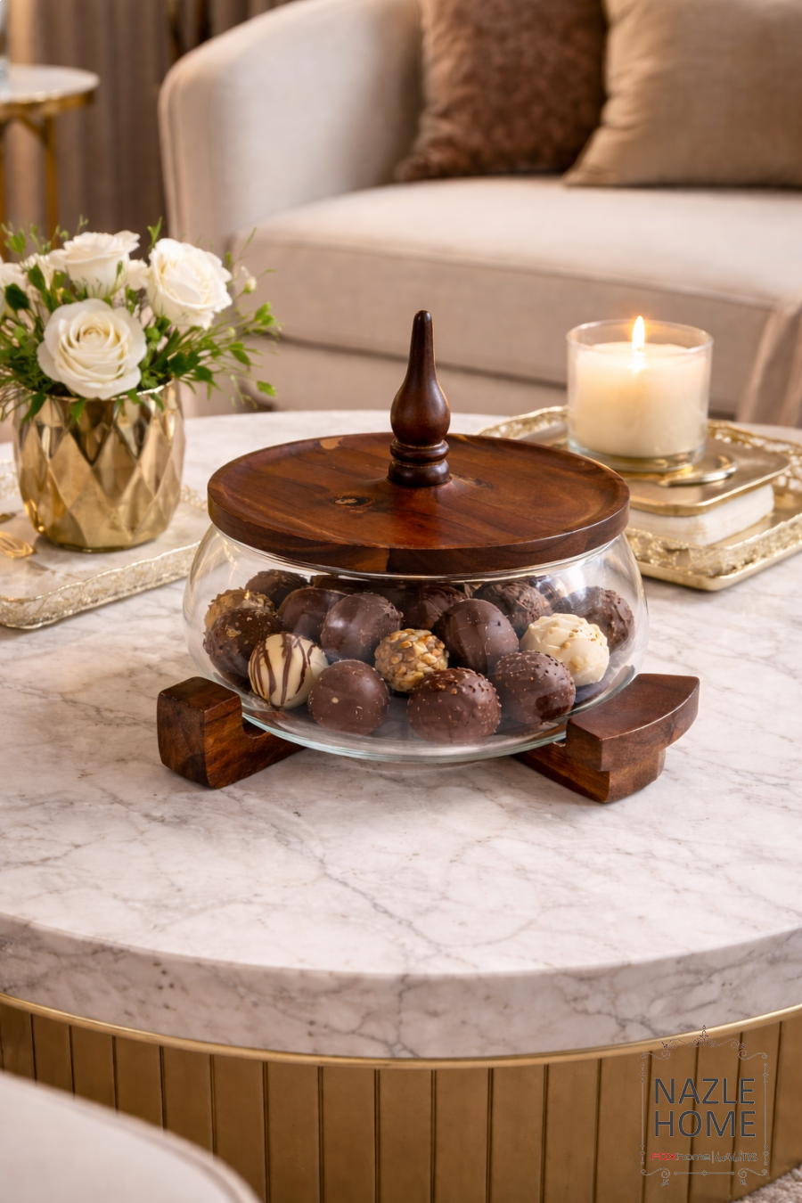 مضيفة زجاج مع قاعدة خشب لتقديم الحلويات
