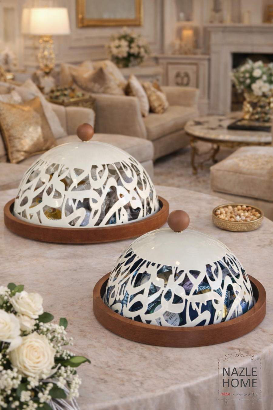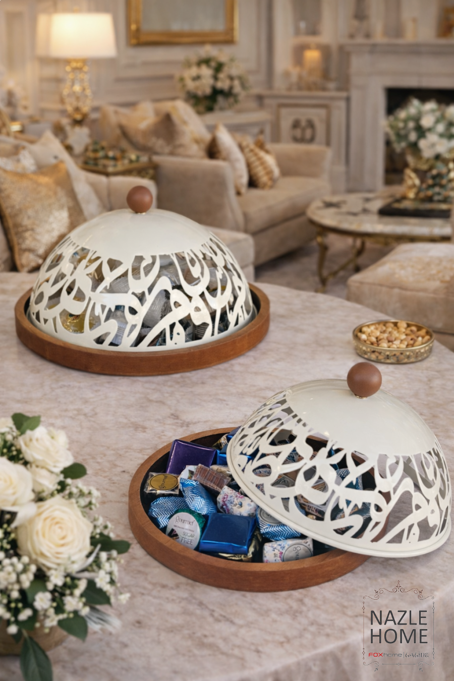 مضيفة تقديم دائري خشب غطا معدن لون بيج و خشبي
