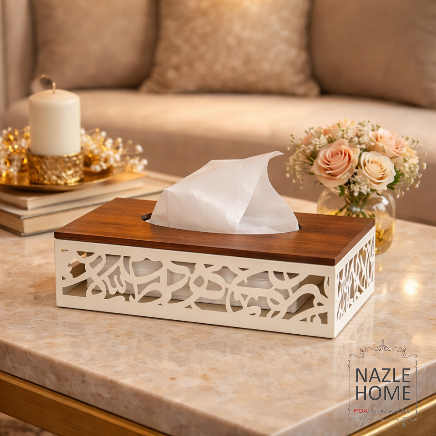 بكيت محارم معدن وخشب خط عربي لون بيج و خشبي