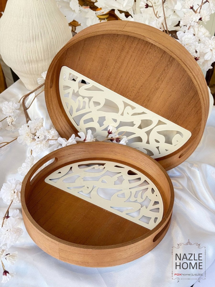 طقم صواني دائري قطعتين خط عربي لون بيج و خشبي