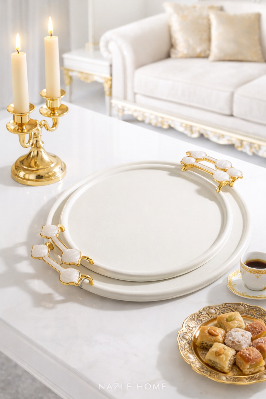 طقم صواني قطعتين دائري يد ذهبي