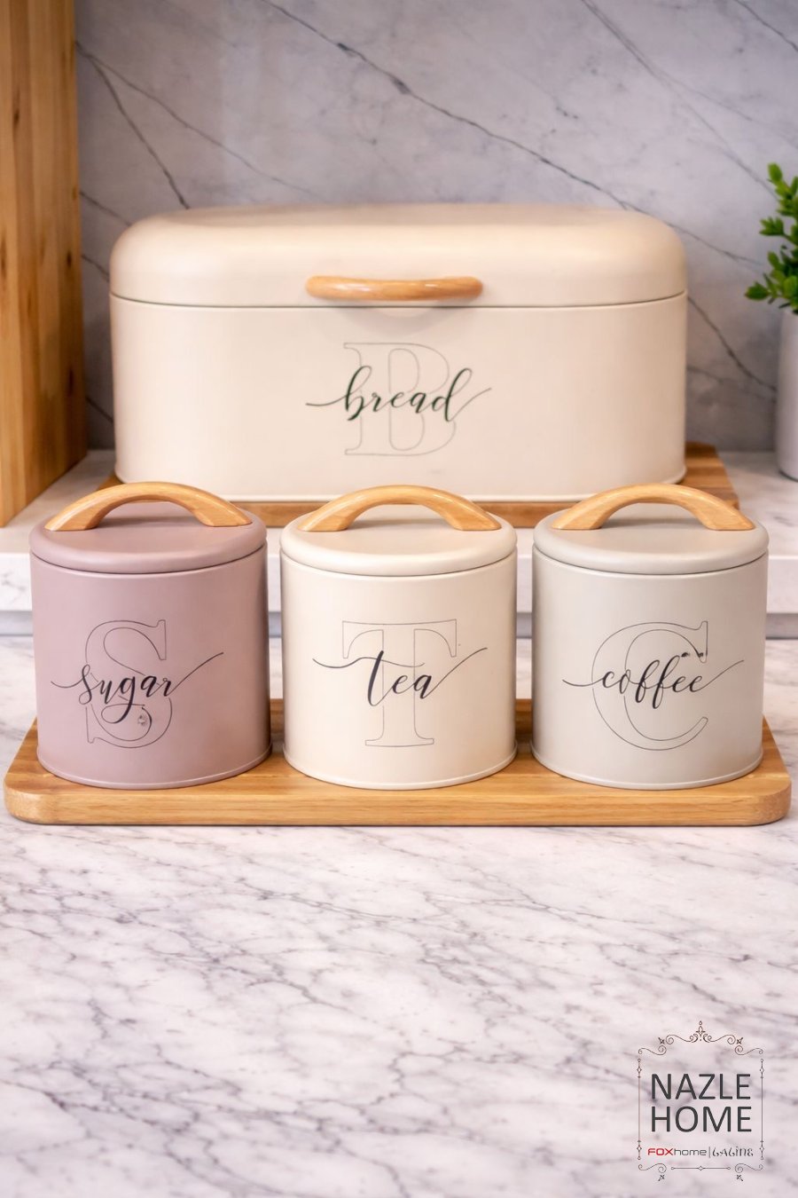 طقم معدن 4 قطع حافظة خبز + سكريات مسكة خشب new collection