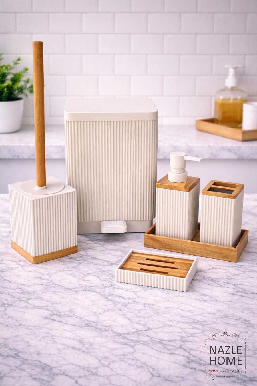 طقم حمام 6 قطع بيج وخشبnew collection