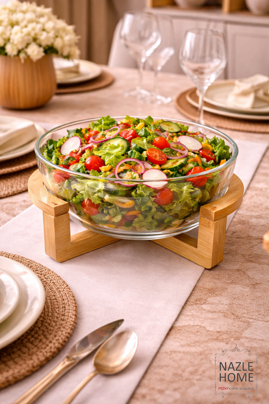 صحن زجاج للتقديم مع قاعدة خشب