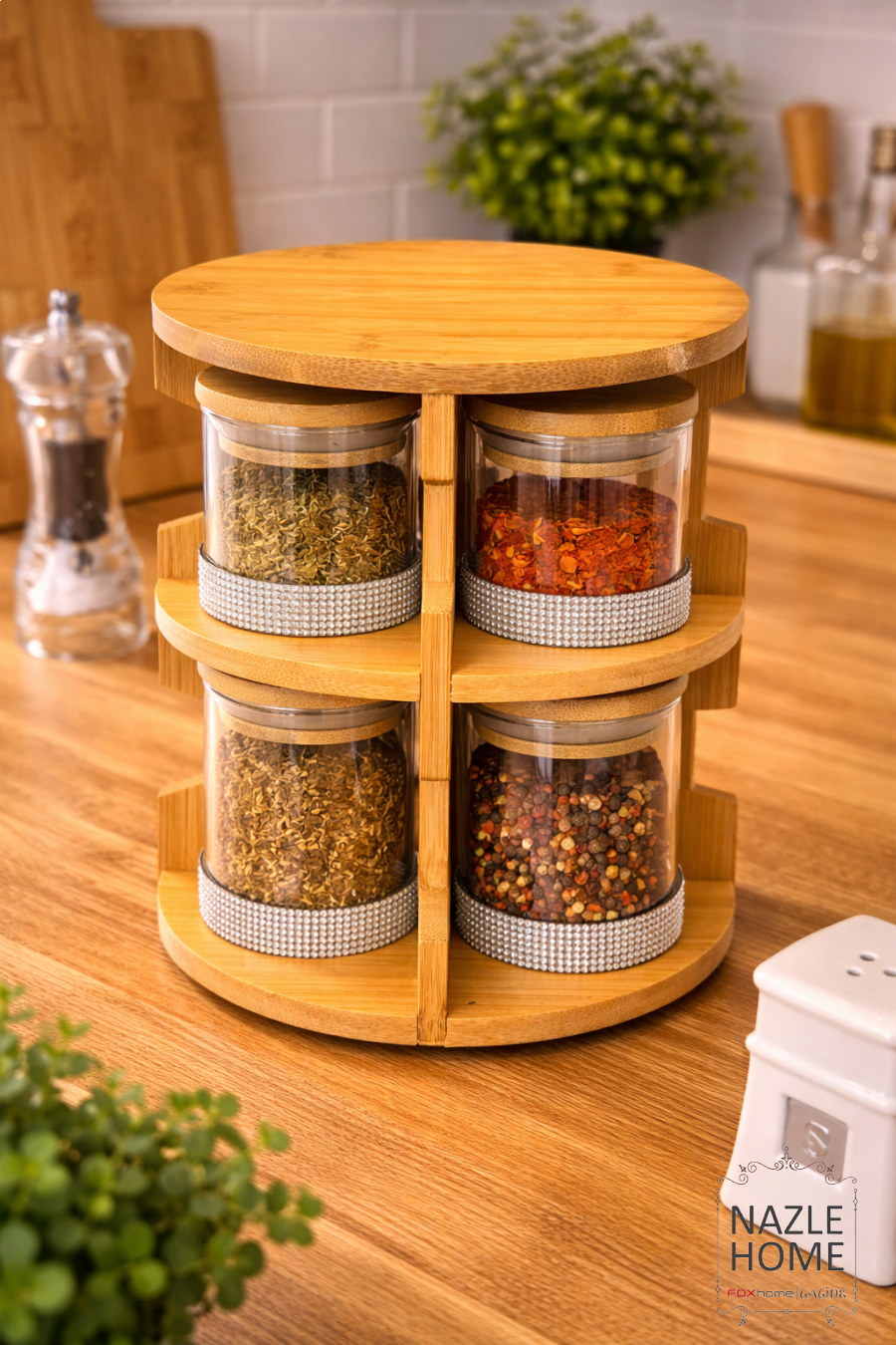 طقم بهارات خشب طبقتين مع 8 علب زجاج