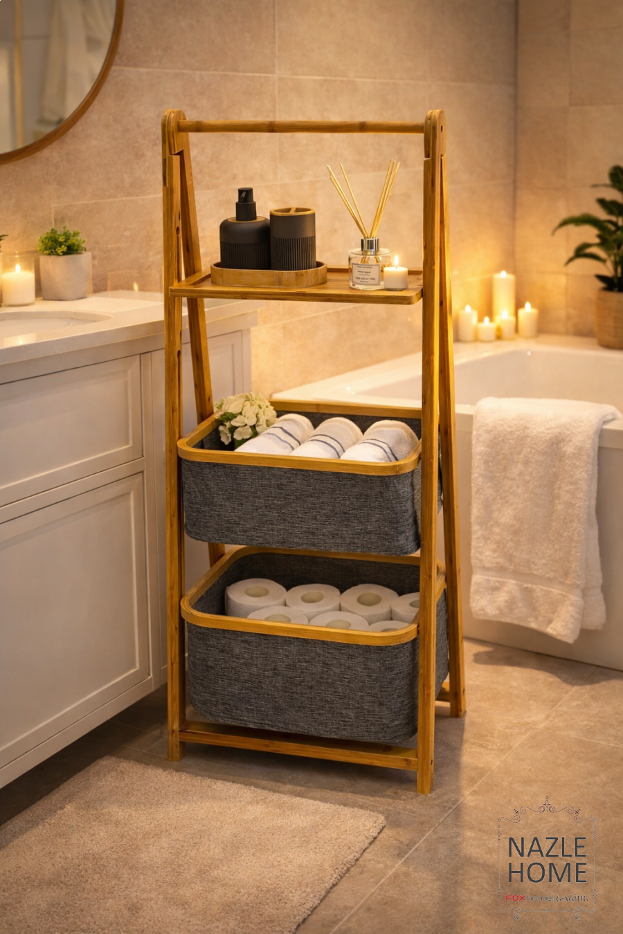ستاند ديكور للحمام رف + سلتين قماش رمادي
