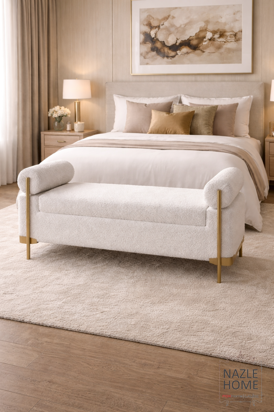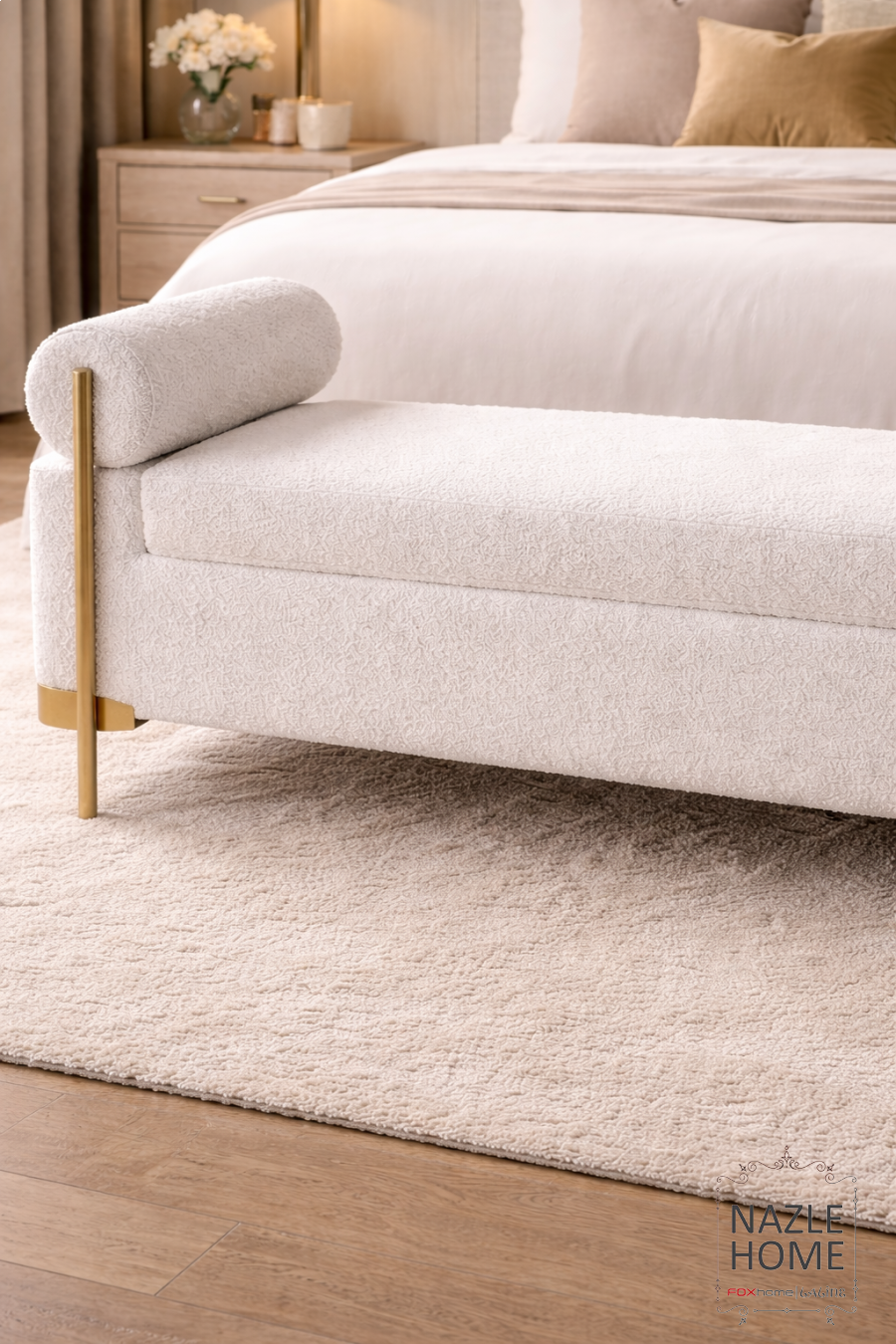 مقعد ديكور فاخر 115*40*40 لون افوايت بلمسة ذهبية