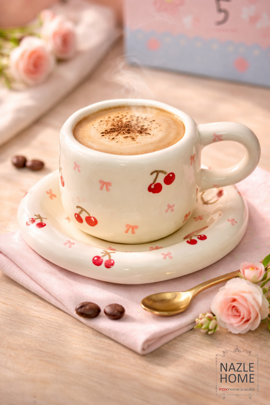 مج ترند ابيض نقشة كرز مع صحن 🍒