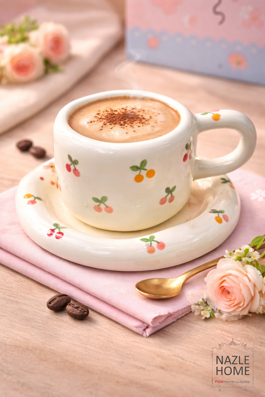 مج ترند ابيض نقشة كرز 🍒 مع صحن