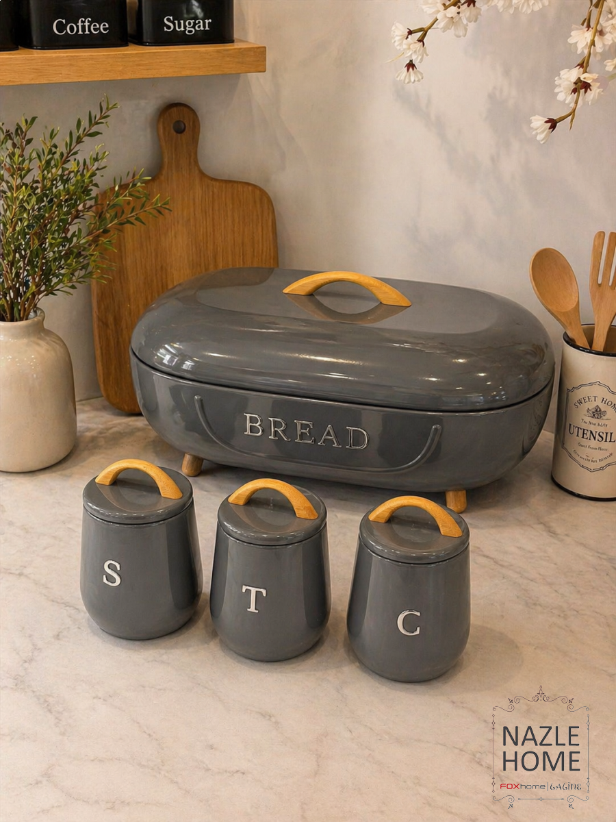 طقم حافظة خبز + 3 سكريات لون رمادي معدن يد خشب