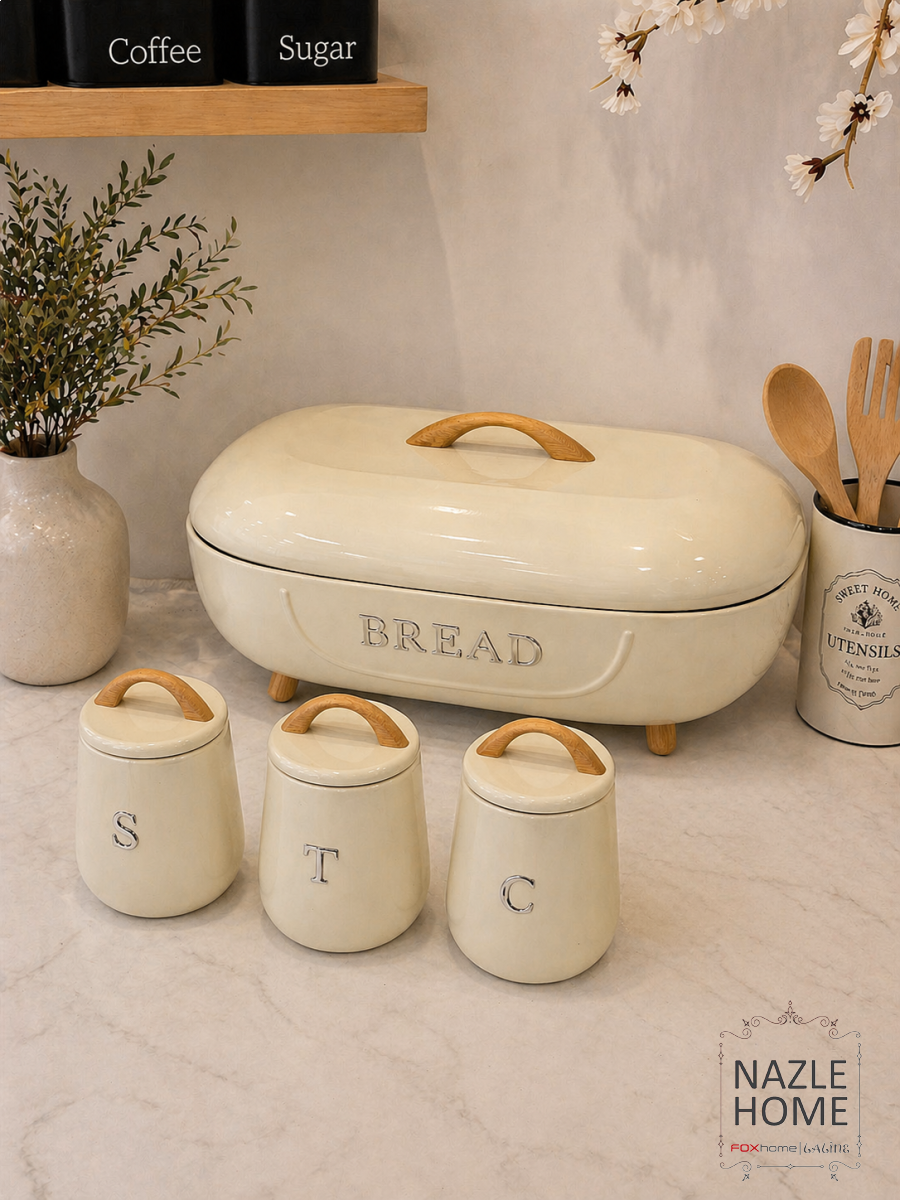 طقم حافظة خبز + 3 سكريات لون افوايت معدن يد خشب